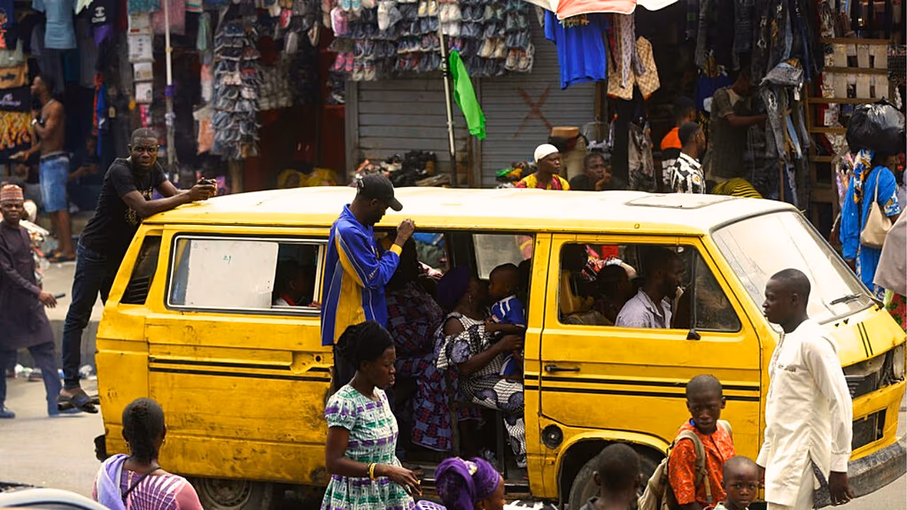 Azeez Akanni wipes sweat from his face as he squeezes into a crowded yellow bus heading to the busy business district of Lagos.